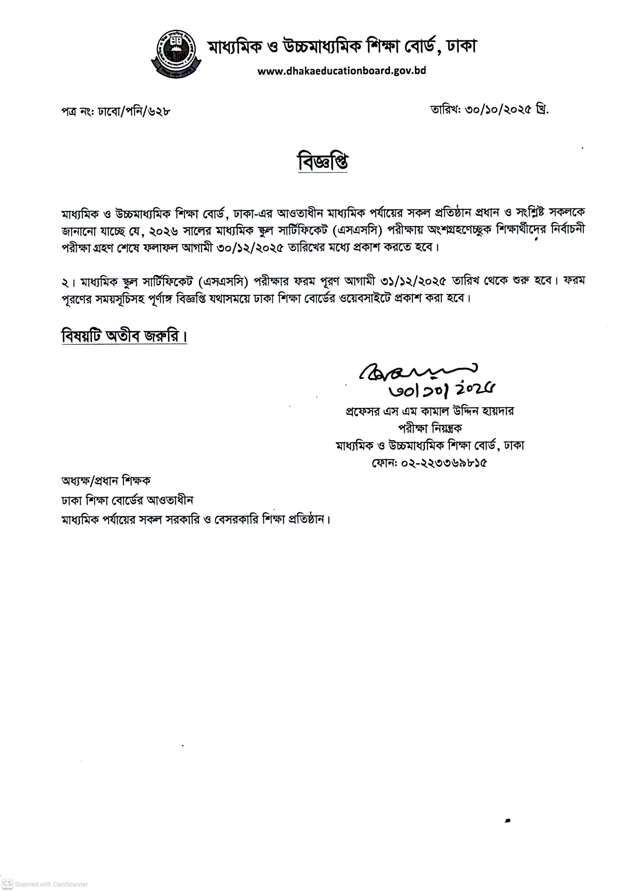 Description : মাধ্যমিক ও উচ্চমাধ্যমিক শিক্ষা বোর্ড , ঢাকা, ৩০-১০-২০২৫ ইং তারিখের বিজ্ঞপ্তি মোতাবেক প্রকাশিত হলো।