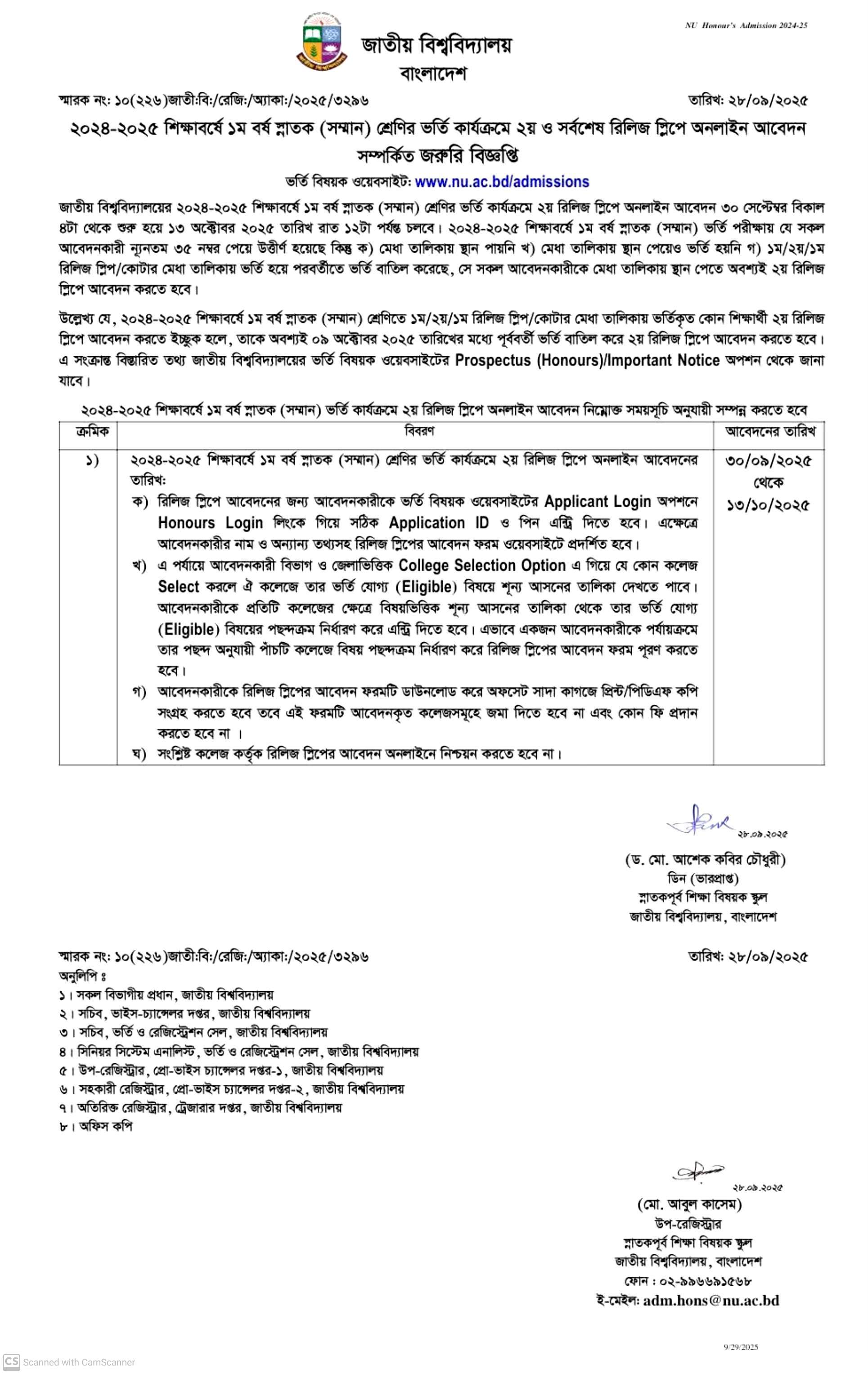 Notice Head : ২০২৪-২০২৫ শিক্ষাবর্ষে ১ম বর্ষ স্নাতক (সম্মান) শ্রেণির ভর্তি কার্যক্রমে ২য় ও সর্বশেষ রিলিজ স্লিপে অনলাইন আবেদন সম্পর্কিত জরুরি বিজ্ঞপ্তি।